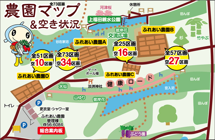 滑川町では、里山の自然空間の中で都市住民が農業とふれあっていただけるよう谷津(やつ)の里(さと)ふれあい農園を整備しました。傾斜地の畑に夕日がさしこみ、とてもやすらげる農園です。自ら土を耕し農作物を作ってみませんか。手ぶらで来園いただいても、基本的な道具や、肥料なども取り揃えております。(農具はレンタル無料、肥料は販売しております)現在223区画ありますので、どうぞお気軽にご応募ください。お待ちしております。